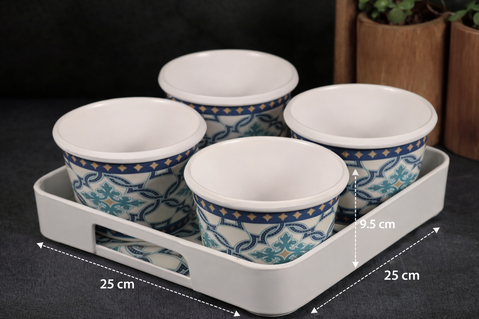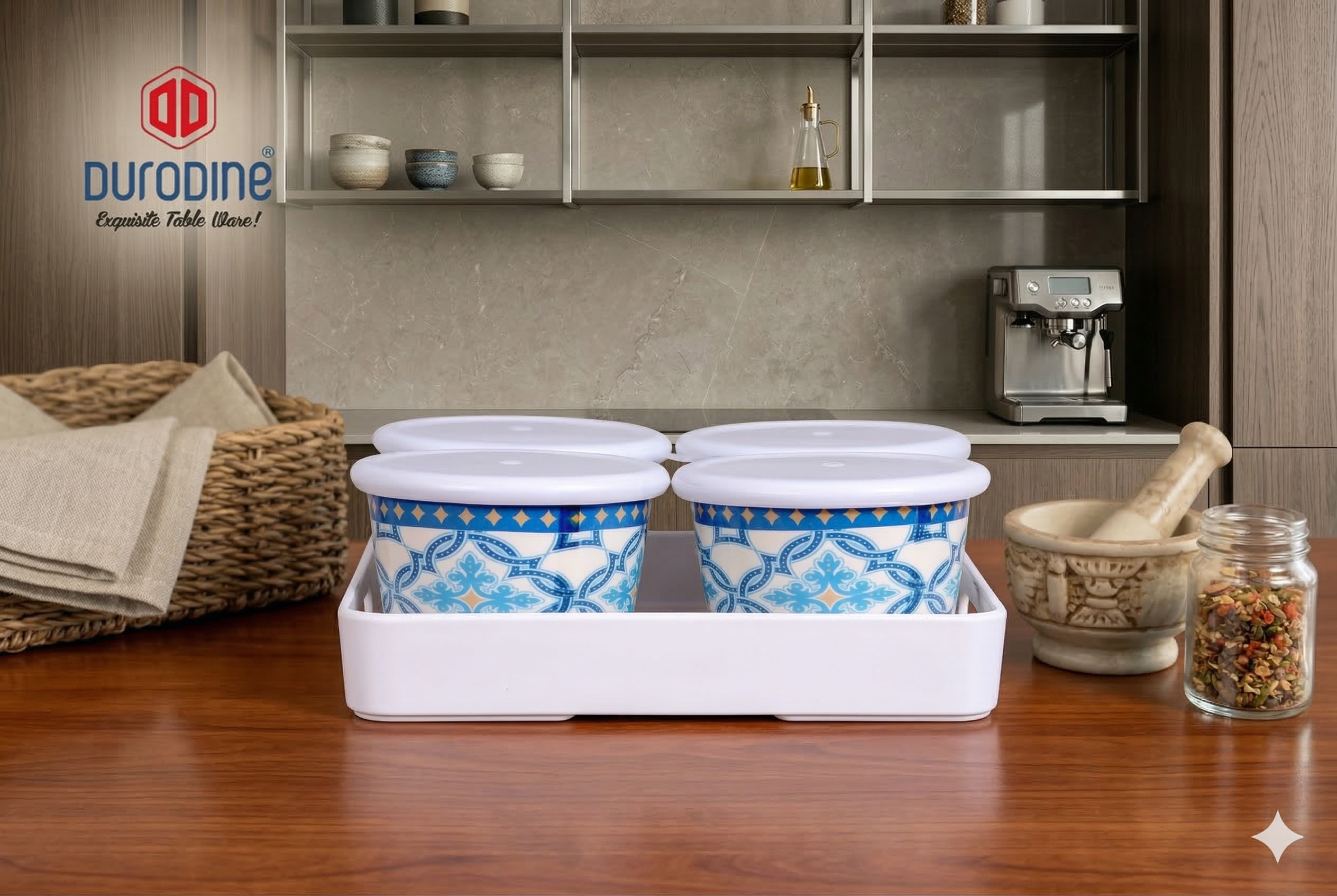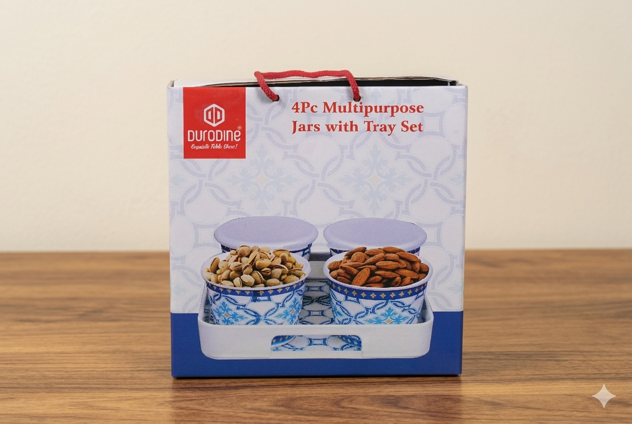 Organise your kitchen or dining table with the DURODINE 4 PC MULTIPURPOSE JARS WITH TRAY SET. This handy set includes four compact jars placed on a matching tray, ideal for storing spices, sugar, masalas, dry fruits, mukhwas, mouth fresheners, pickles or condiments. The jars come with lids to keep contents fresh and hygienic, while the tray makes it easy to carry and serve. Made from durable, food-safe material, this set is long-lasting, easy to clean and suitable for daily use. Perfect for homes, restaurants and gifting, it adds both functionality and elegance to your storage and serving needs.