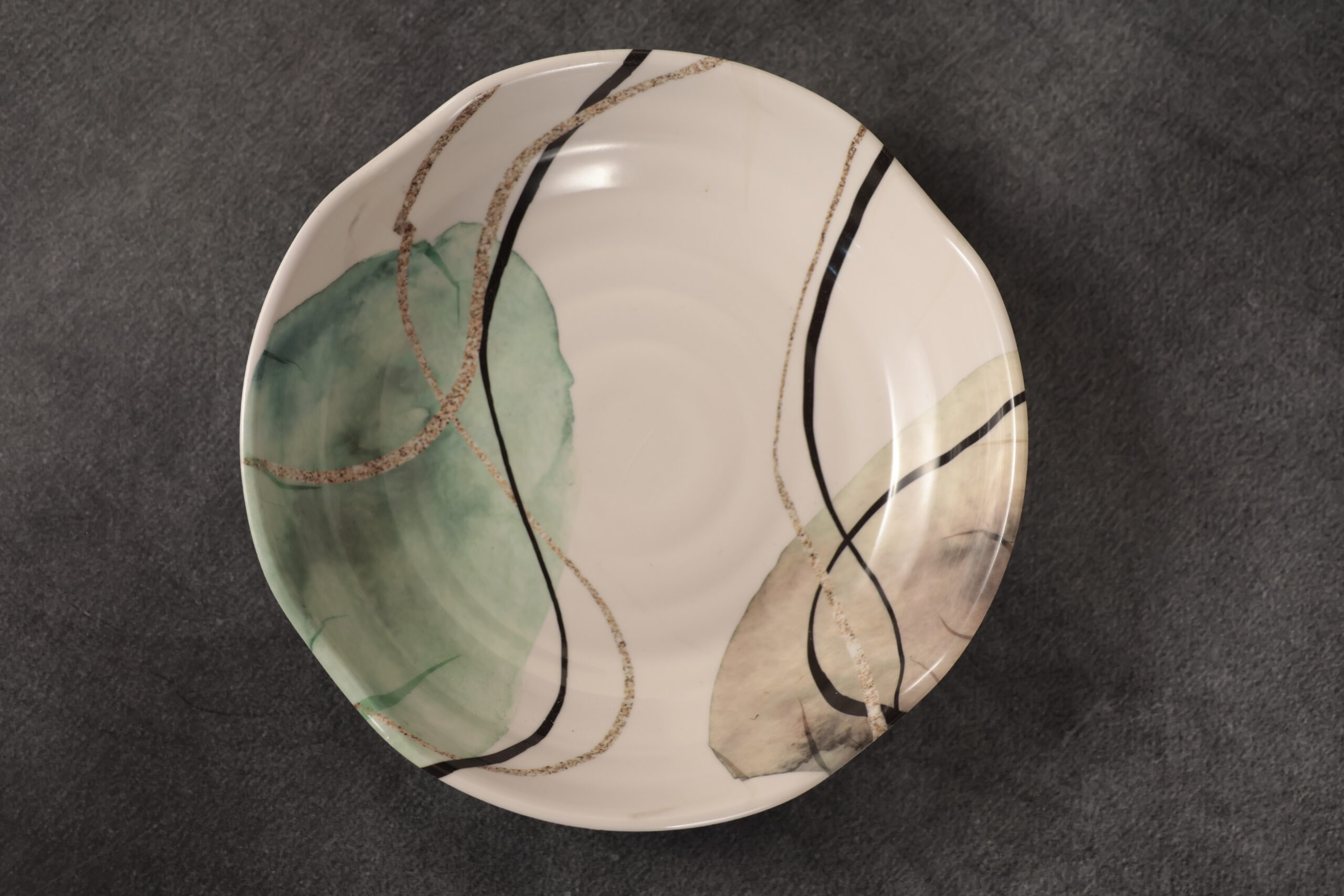Round uneven spiral Dahi Bhalla plate with designer pattern, perfect for stylish serving of chaat, starters and festive dishes.